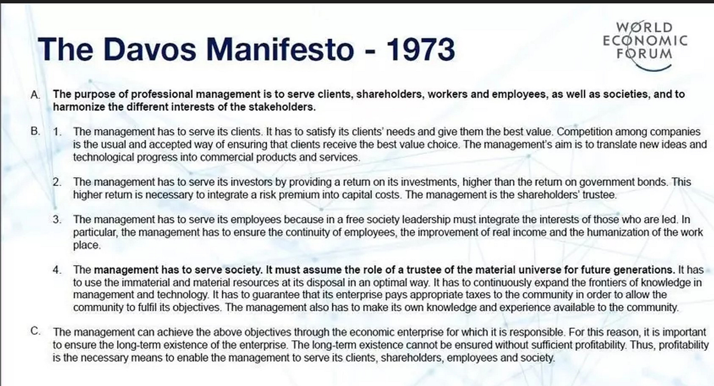 The Davos Manifesto - 1973 is the platform for a Global Fascist Regime where the Management is Big Brother, the Corporations are the Stakeholders and WE (humans With Empathy), well WE are Useless Eaters…